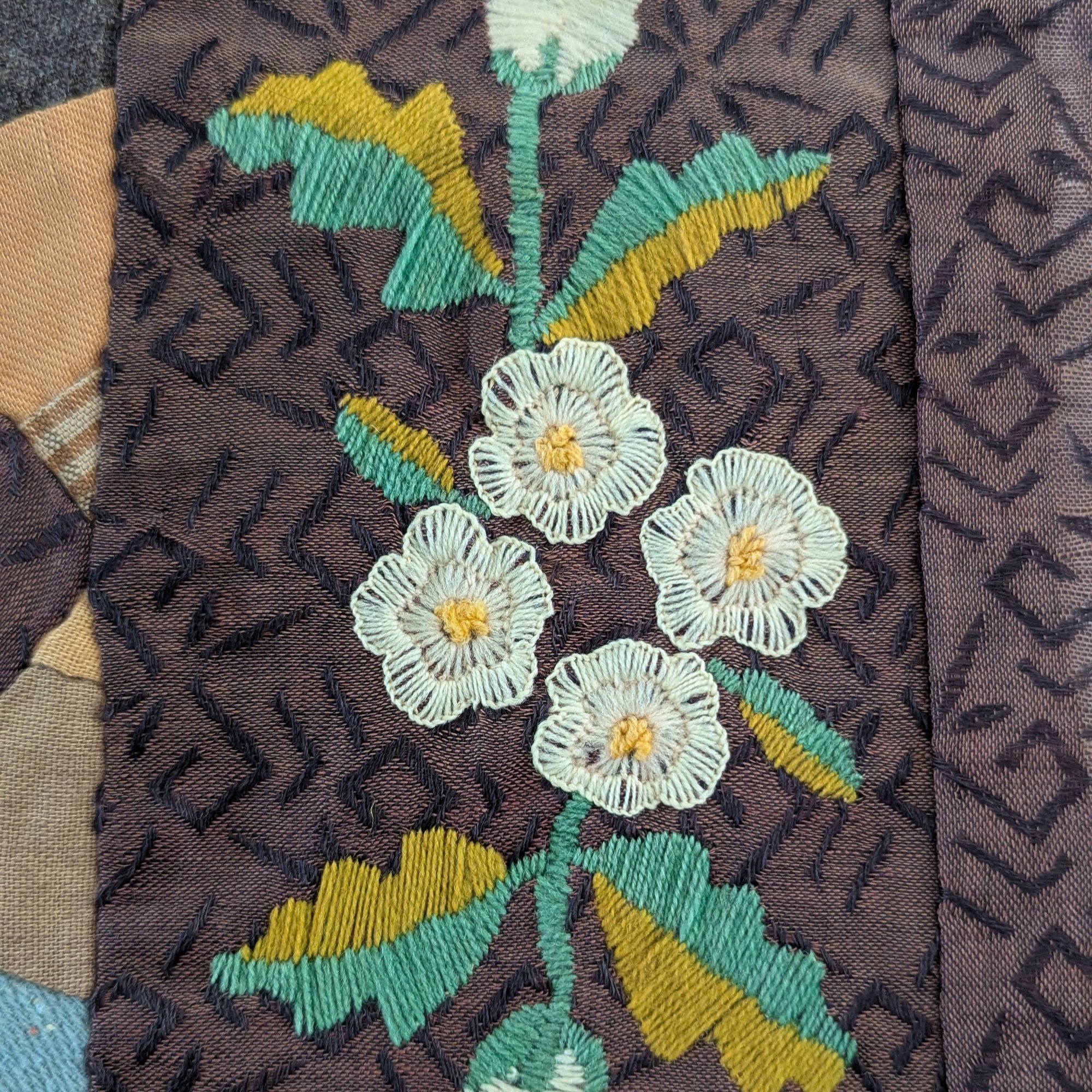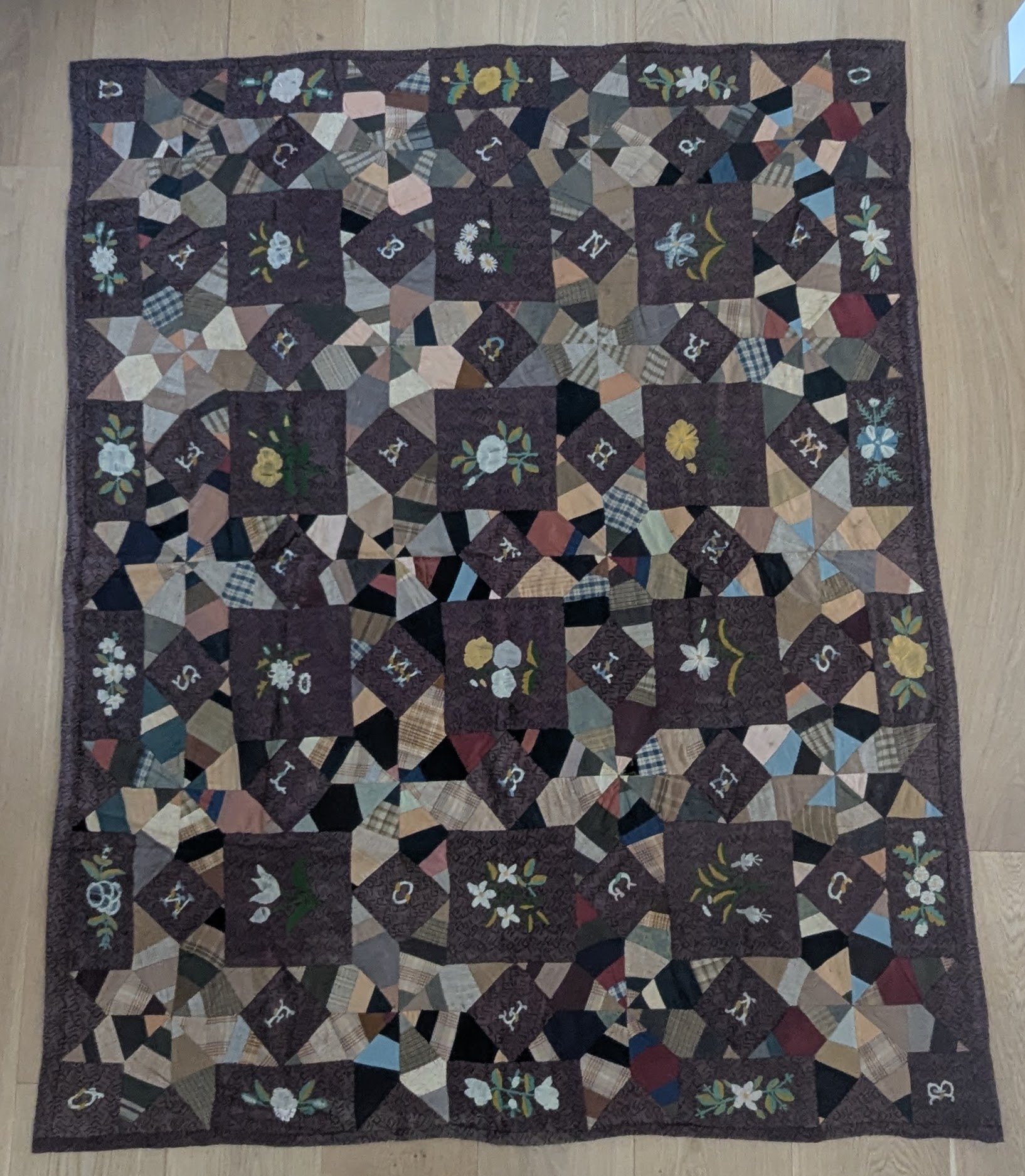 Pieced String with Embroidered Alphabet and Flowers Coverlet