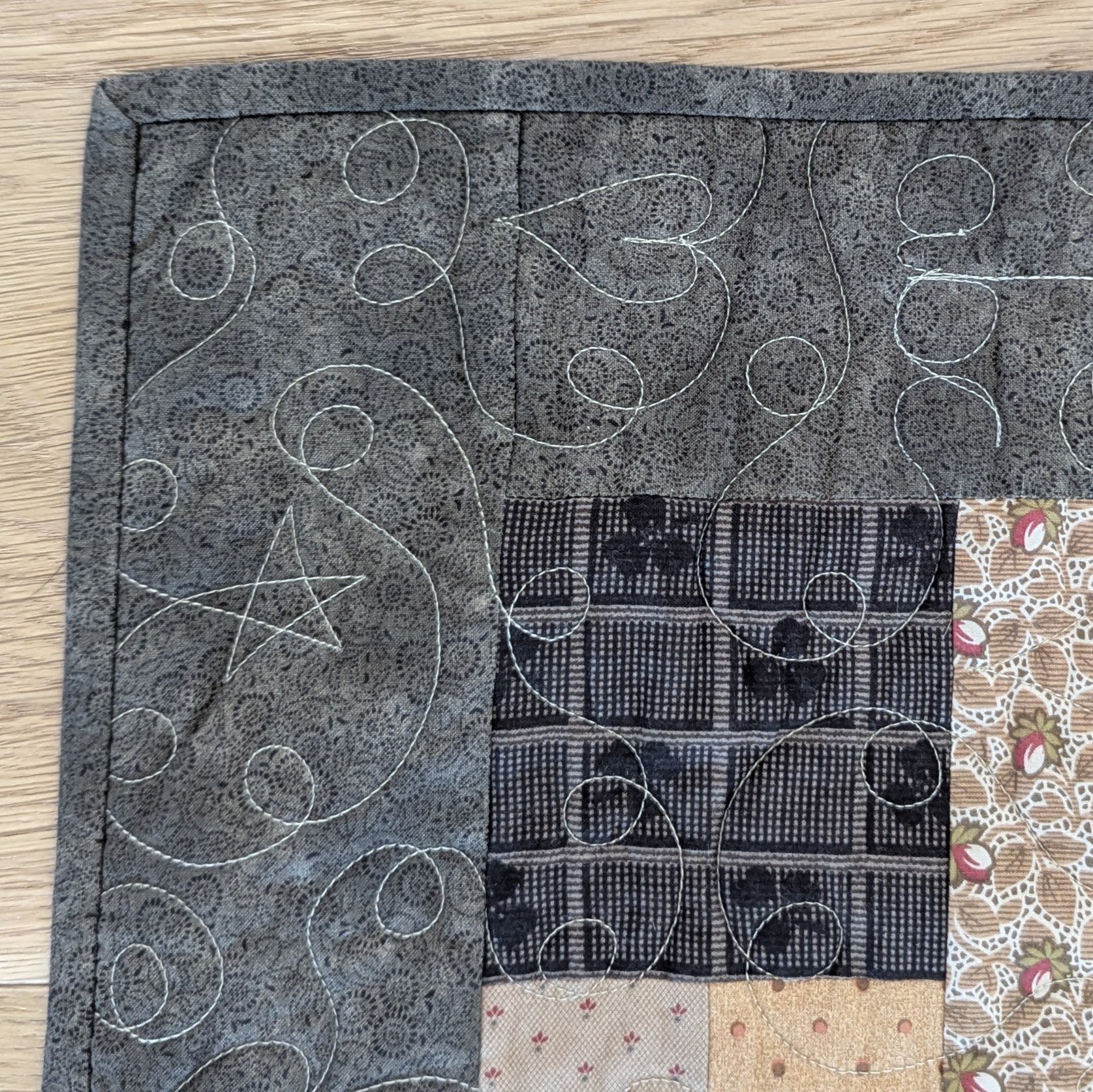 Simple piecing, hand appliqué, hand embroidery, machine quilted.