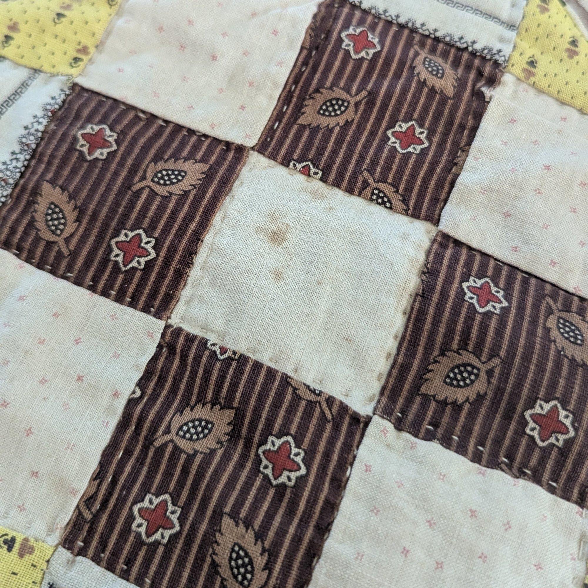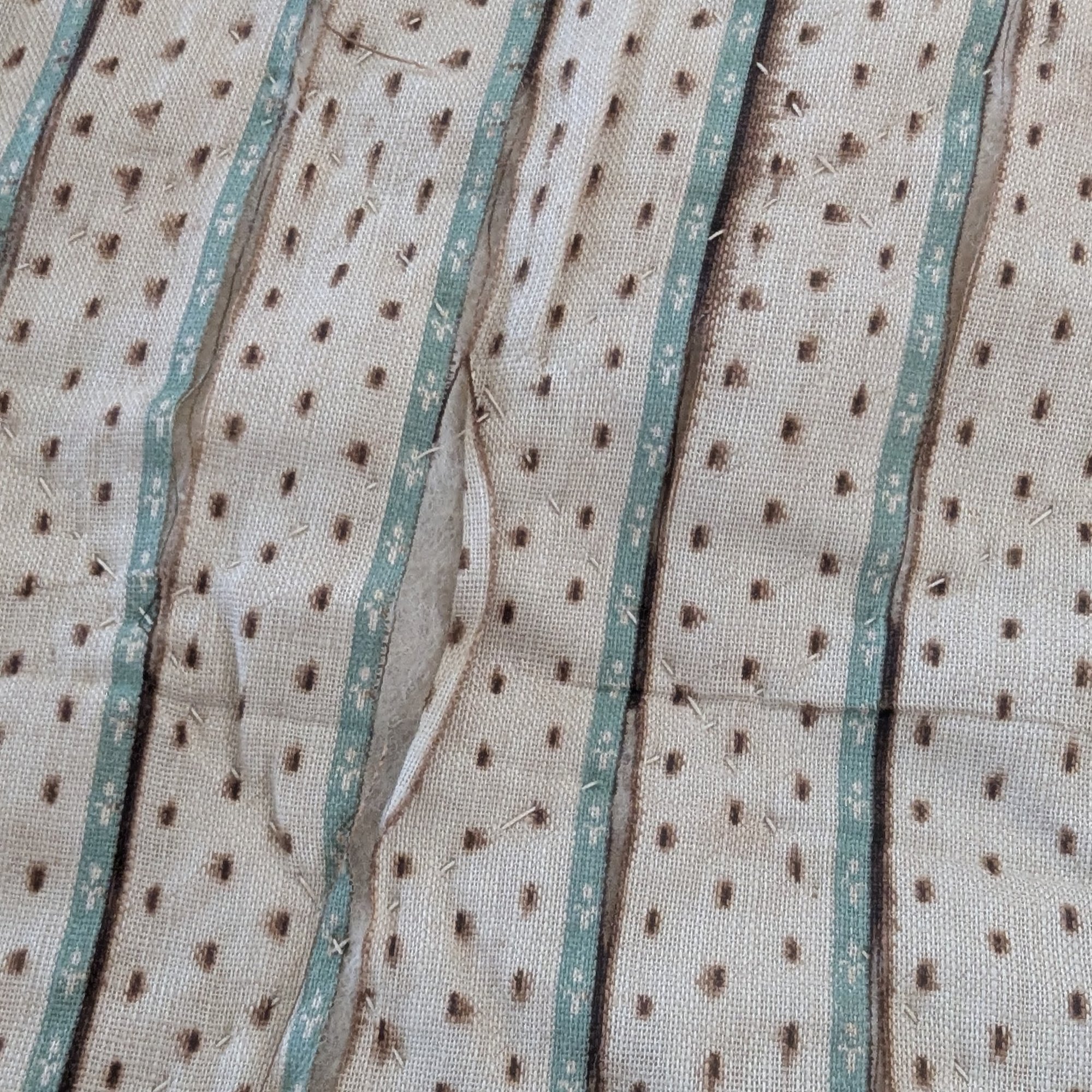 - Age related damage to the backing fabric where dark brown stripe is disintegrating,