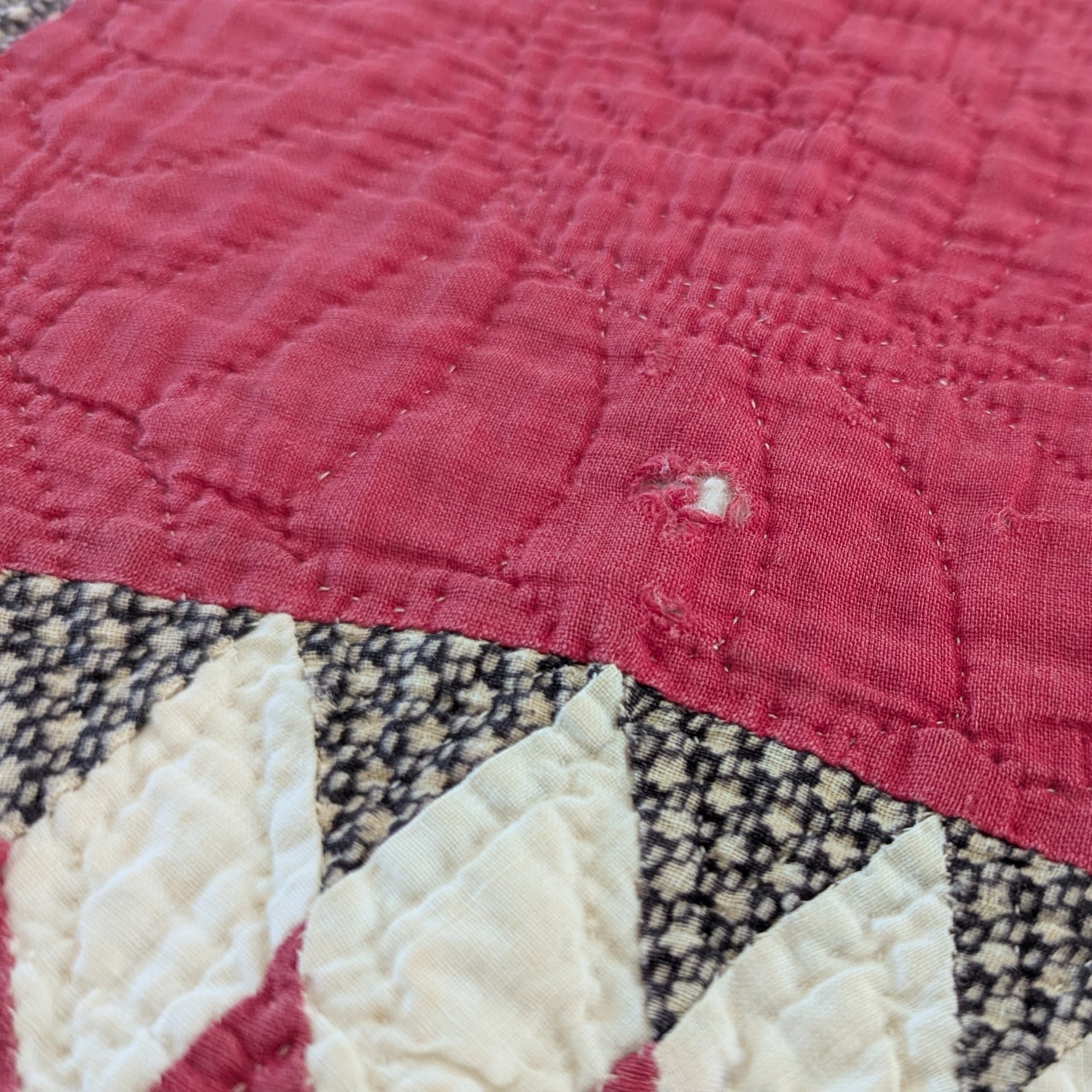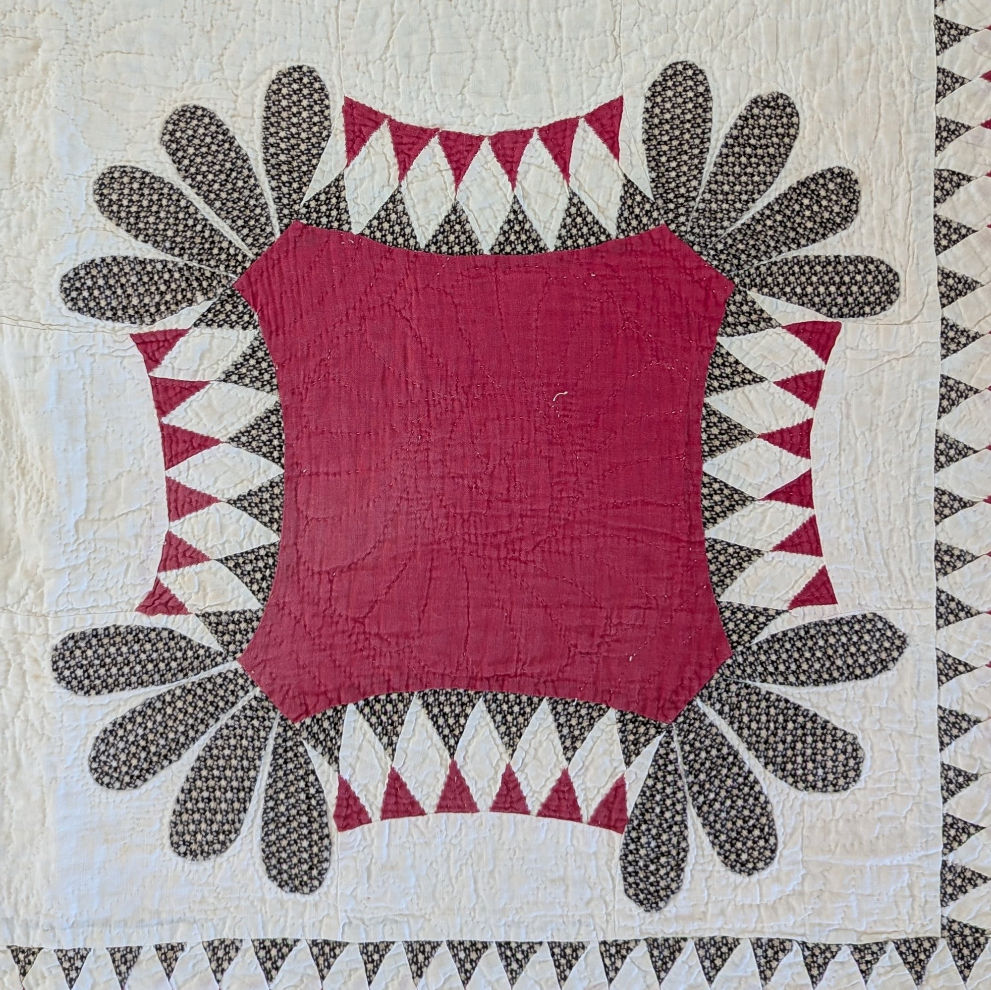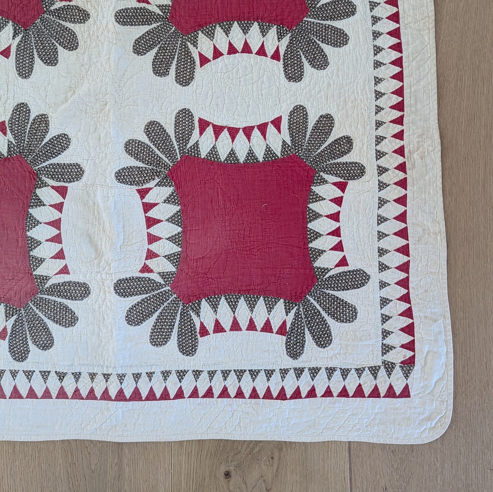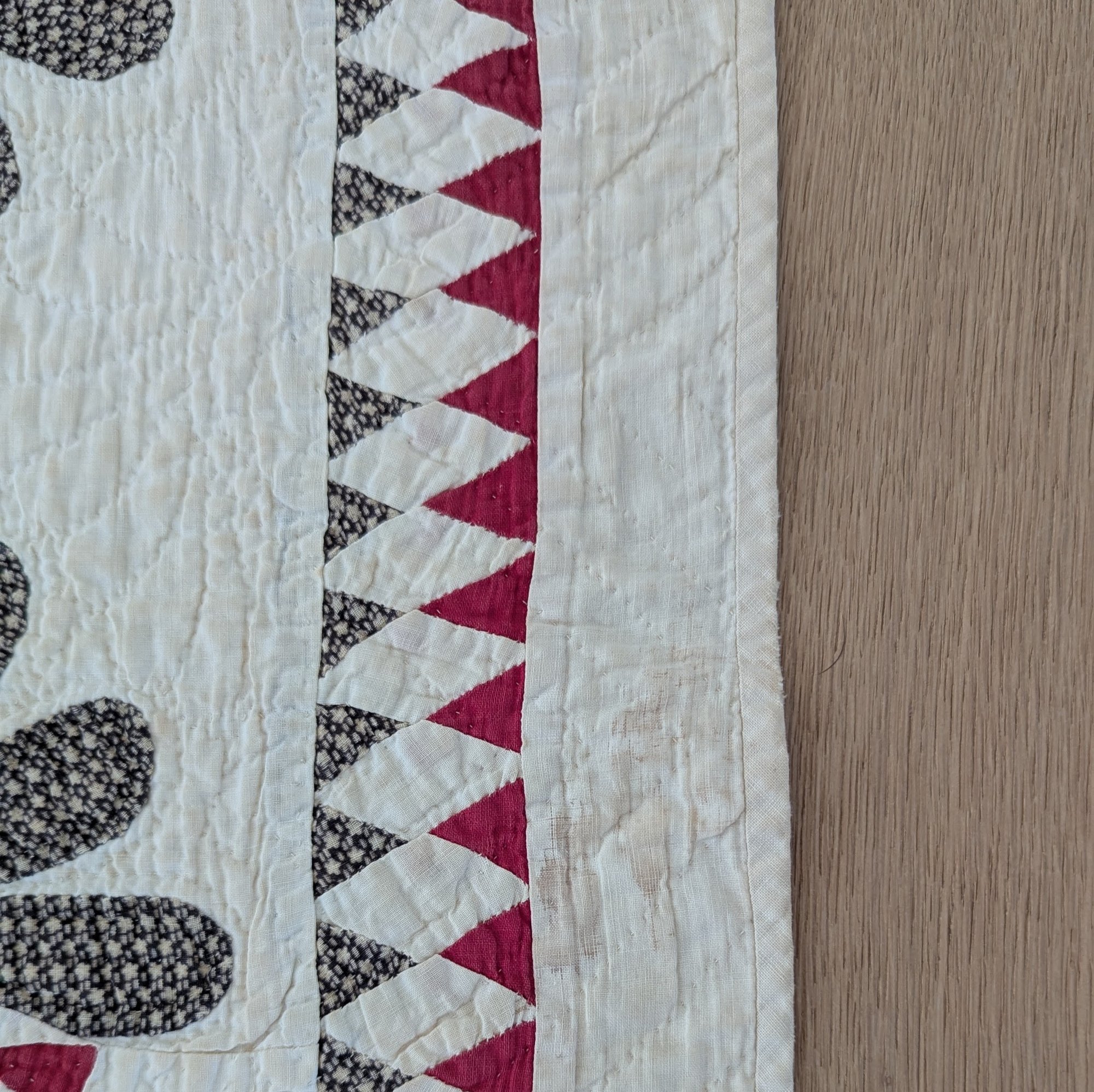 This beautiful quilt is appliqued and pieced of fabrics of that time period. The unique saw tooth border mirrors the saw tooth piecing on each block. It came from a private collection in Missouri and it is thought to have been made in Pennsylvania sometime prior to the civil war.